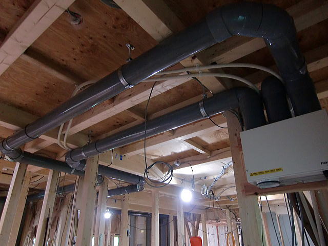 エコエネの住まい(家)~換気システム配管工事完了 2012年10月9日– コメント:0– エコエネの住まい(家)の換気システム用配管工事が完了いたしました。 今回は、間取りの関係で、排気用配管材の施工が難しく苦労いたしましたが 無事完了することが出来ました。 下記は現場写真となります。 各配管材は、内径125㎜の配管を使用しておりますが、 配管材内部を空気が通過する際の圧損等も考慮しております。 今週中には建物外部の外壁材も施工完了する予定でおりますが、 天気が良い日が続くことを願う毎日です。 Tags:換気システム コメント Cancel reply Δ