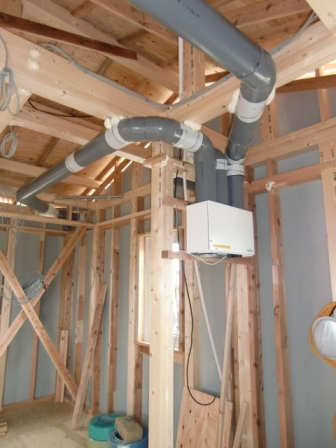 仕上げの寸法位置場所に、換気システム本体を仮設置をして配管工事を行いました。