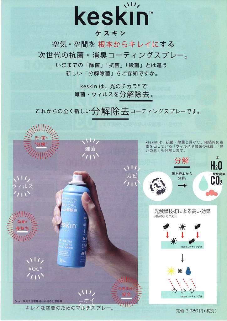 雑菌・ウィルスを分解除去することができる「分解除去コーティングスプレー」です。