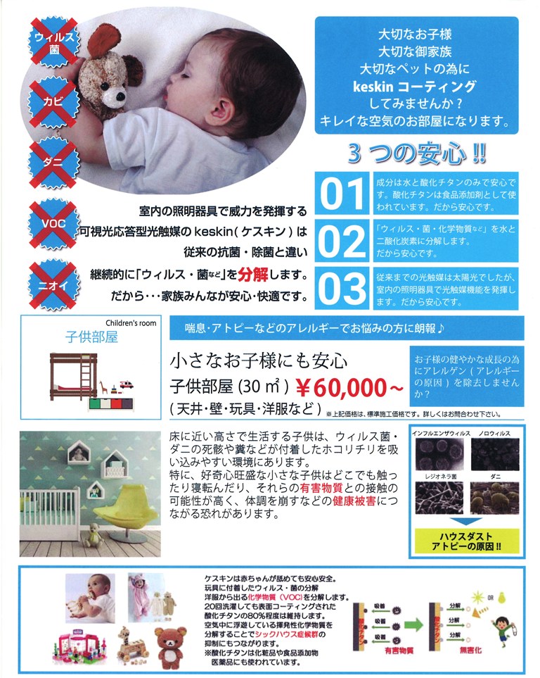 ご利用範囲としては、住まい(家)の室内で気になる「カビ」や「ニオイ」だけにとどまらず、住まい(家)の外壁部分の「カビ汚れ」や、車の内部などの「ニオイ」分解に効果を発揮します。