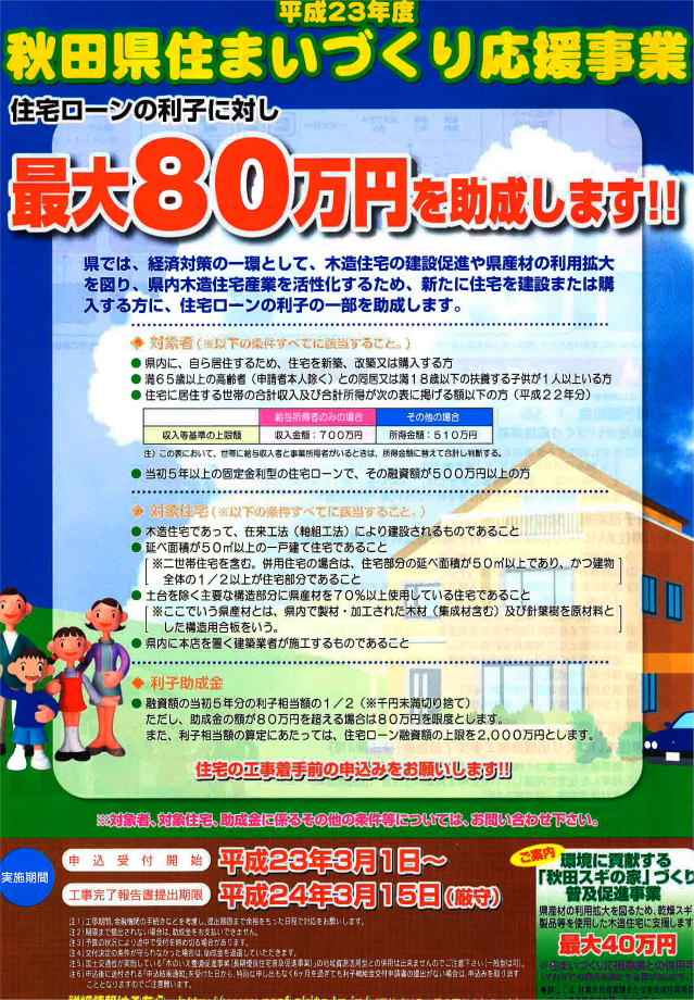 秋田県では経済対策の一環として、木造住宅の建設促進や県産材の利用拡大を図り、県内木造住宅産業を活性化するため、新たに住宅を建設又は購入する方に対し、住宅ローンの利子の一部を助成するという、利子の助成金制度を行っておりますが、内容を抜粋して紹介させていただきます。
