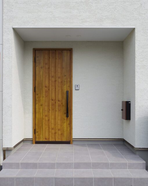 白色系塗壁調の吹付外壁と、木目調の玄関ドアが映えるシンプルモダンな住まい。 オーダーメイドのリビング階段と多くの間接照明を採用、フラットバーを使用した手摺材にもこだわりを感じます。 広々とした玄関・ホールにはシューズクローゼットがあり、ご家族みんなで使用可能なウォークインクローゼットもございます。 施主様と共にじっくりとお打合せをさせていただきながら建築された、完全オーダーメードの建物となっております。