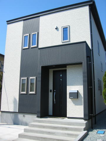 外壁材の配色・バランスは施主様のお考えにより施工を行い、リビングの入口ドアにはモダンな印象を際立たせるブラック色アルミ製ドアを採用。