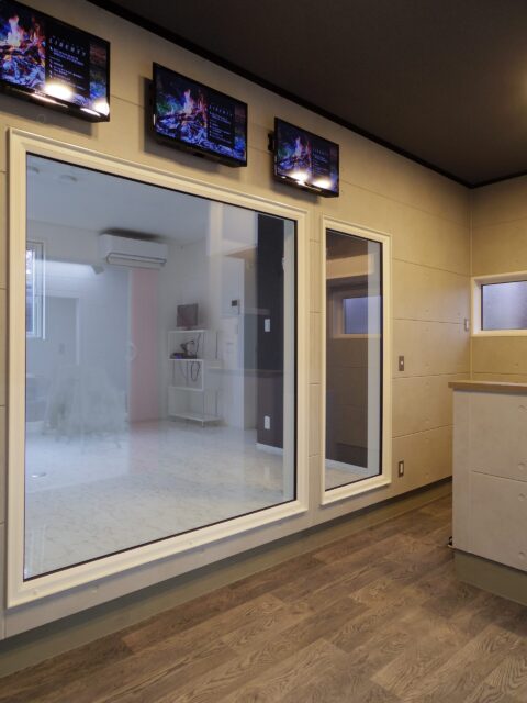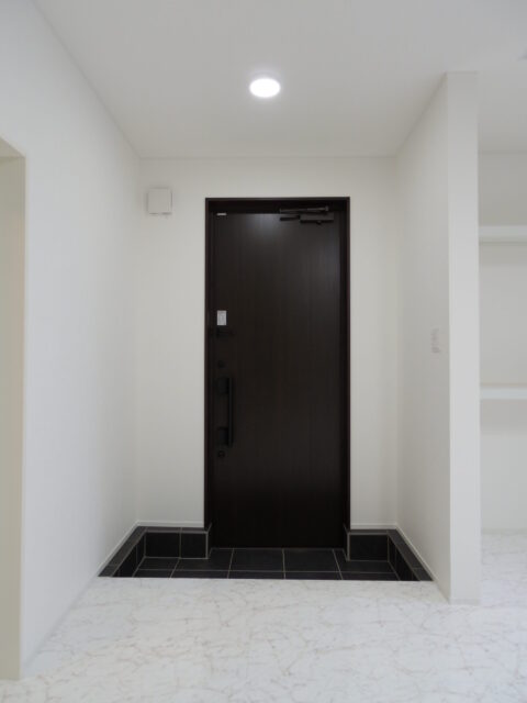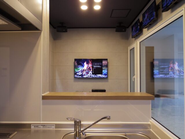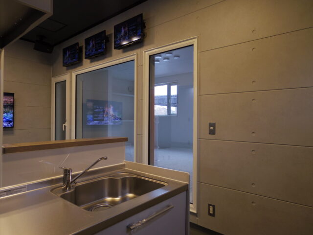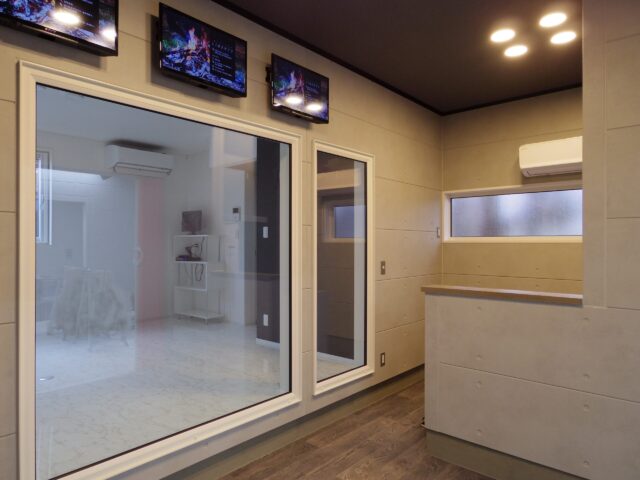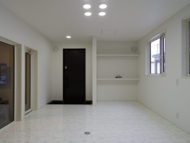 白色のタイル調床材と、アクセントの黒色でまとめたシンプルモダンなお部屋の他にも、古木風の木肌が映える床材と、無機質なコンクリートの風合いが良い壁材を使用したモダンなお部屋もございます。 モダンな雰囲気のお部屋には映像と音が楽しめる設備が設置され、来客者との憩いの空間ともなっています。 その他にもビルトインガレージなど、施主様と共にじっくりとお打合せをさせていただきながら建築された、完全オーダーメードの建物となっております。