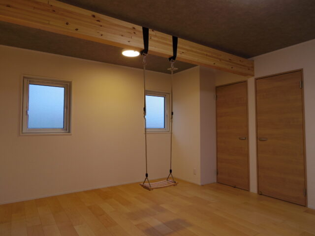 お住まいの建築に最適な東西に長い建築地に建てられた住まい(家)は、効率的な動線と共に日射のコントロールもしやすいような間取りとなっております。 ご家族のプライバシーを確保しながらも、無駄なスペースとなりがちな廊下部分を極力省かれたシンプルな間取りです。 二階のフリースペースには「ブランコ」が設置されており、設置用に施工された専用の梁材がありますので、後からも「ハンモック」などに付け替えたリすることも可能となります。 その他にも造作で造り上げた収納など、施主様と共にじっくりとお打合せをさせていただきながら建築された、完全オーダーメードの住まい(家)となっております。