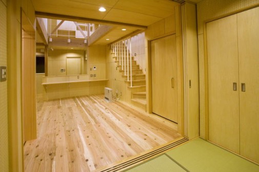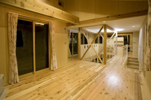 秋田杉の無垢材を床材として使用し、全ての壁にシナ材を使用した明るく創造的な住まい(家)。